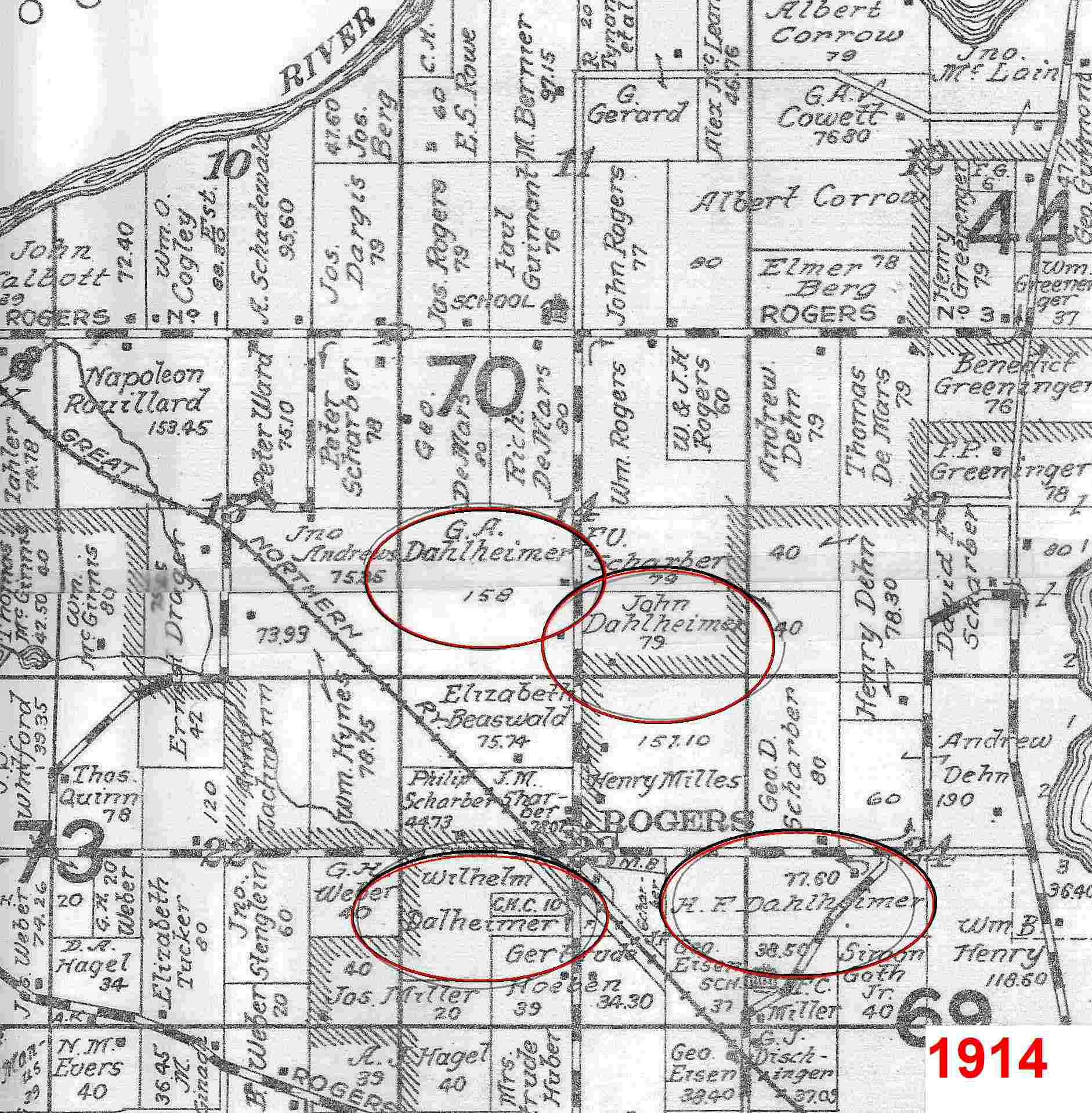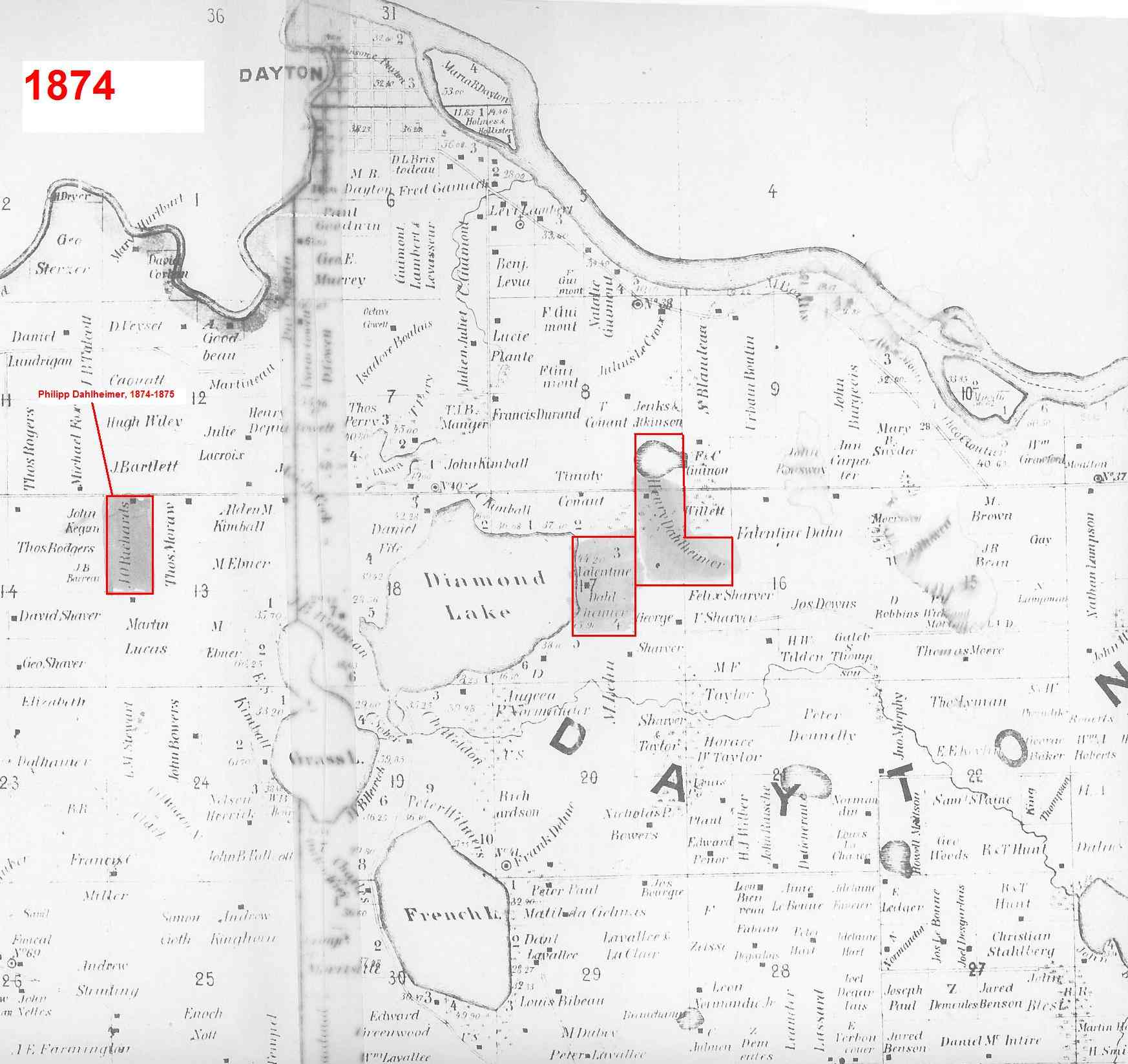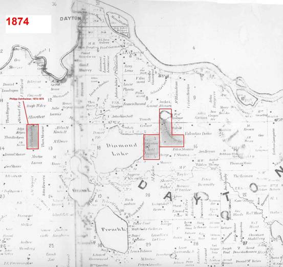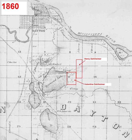 Following is an 1874 map showing these original land purchases by Valentine, Henry, and Philipp Dahlheimer: