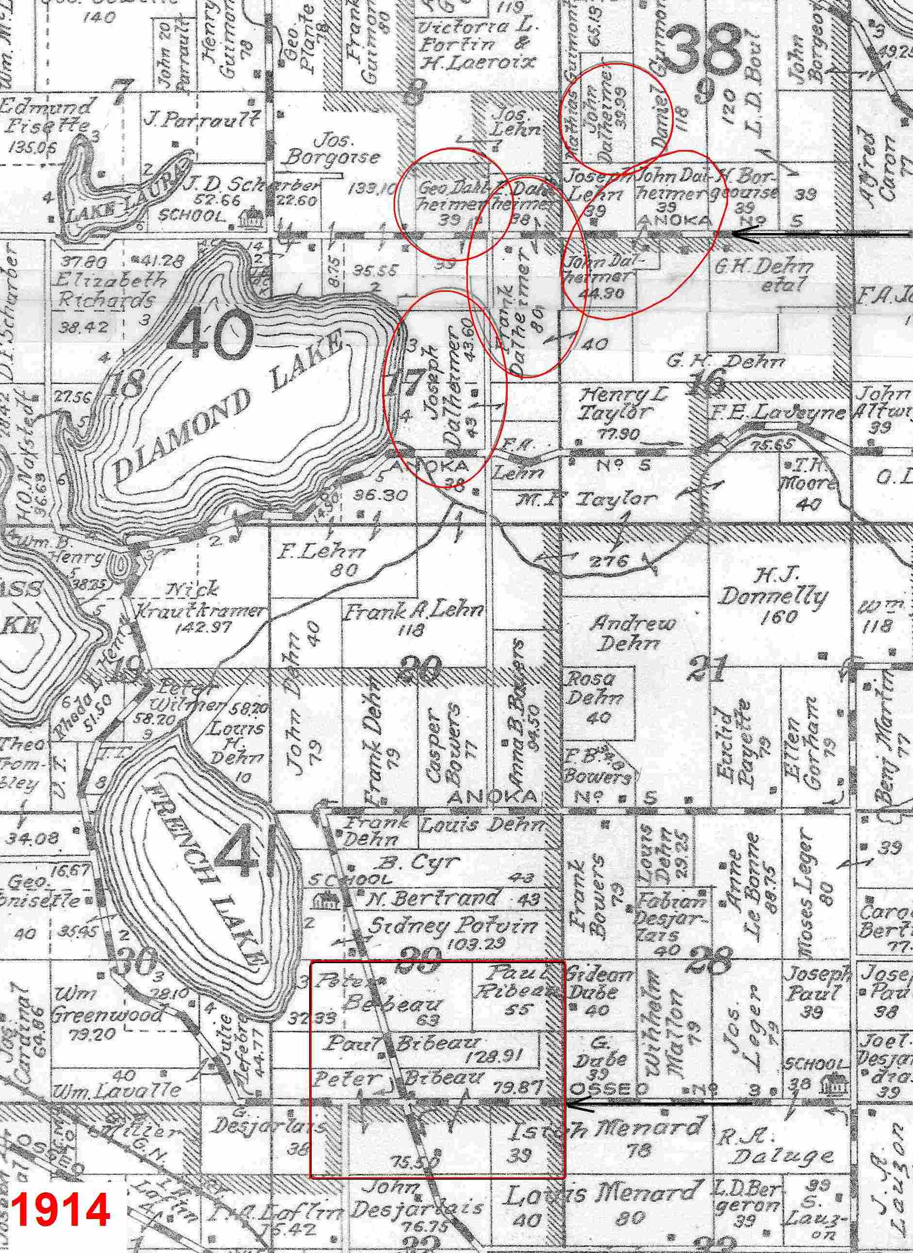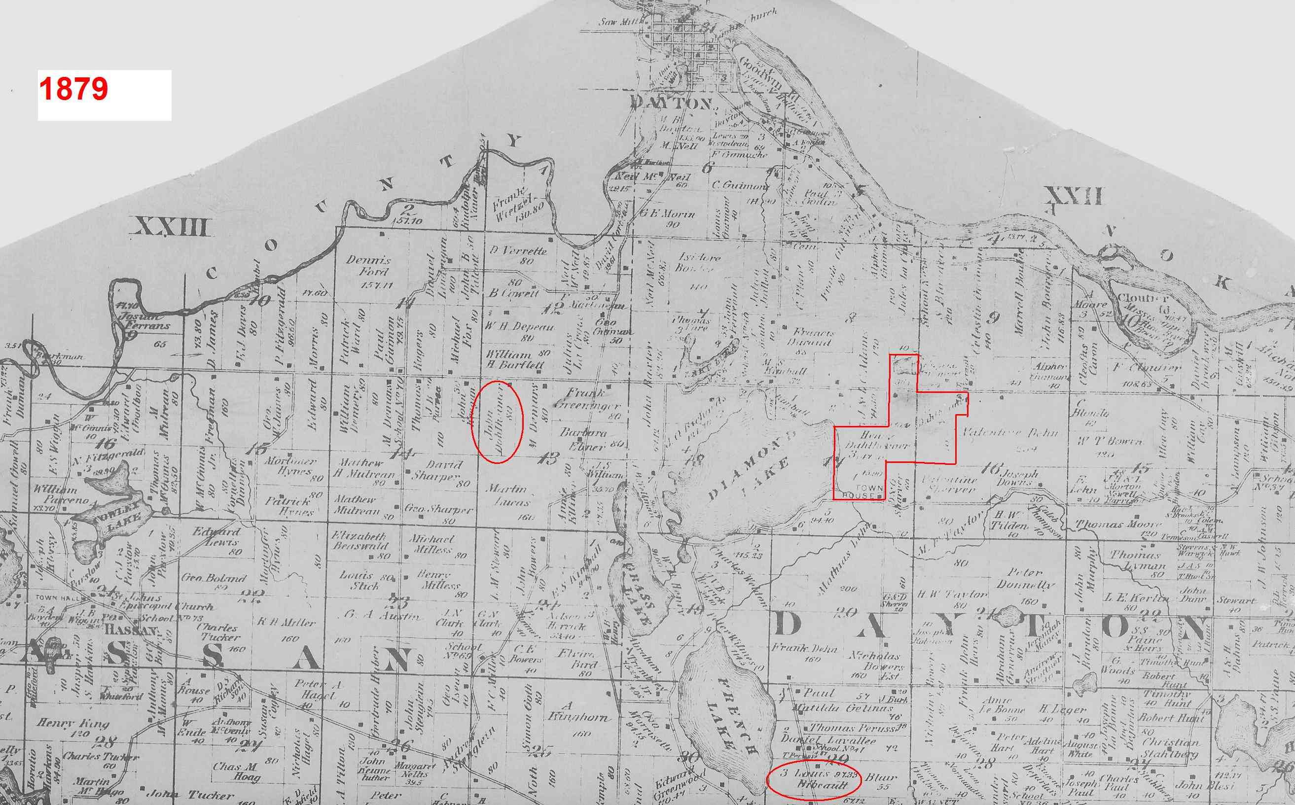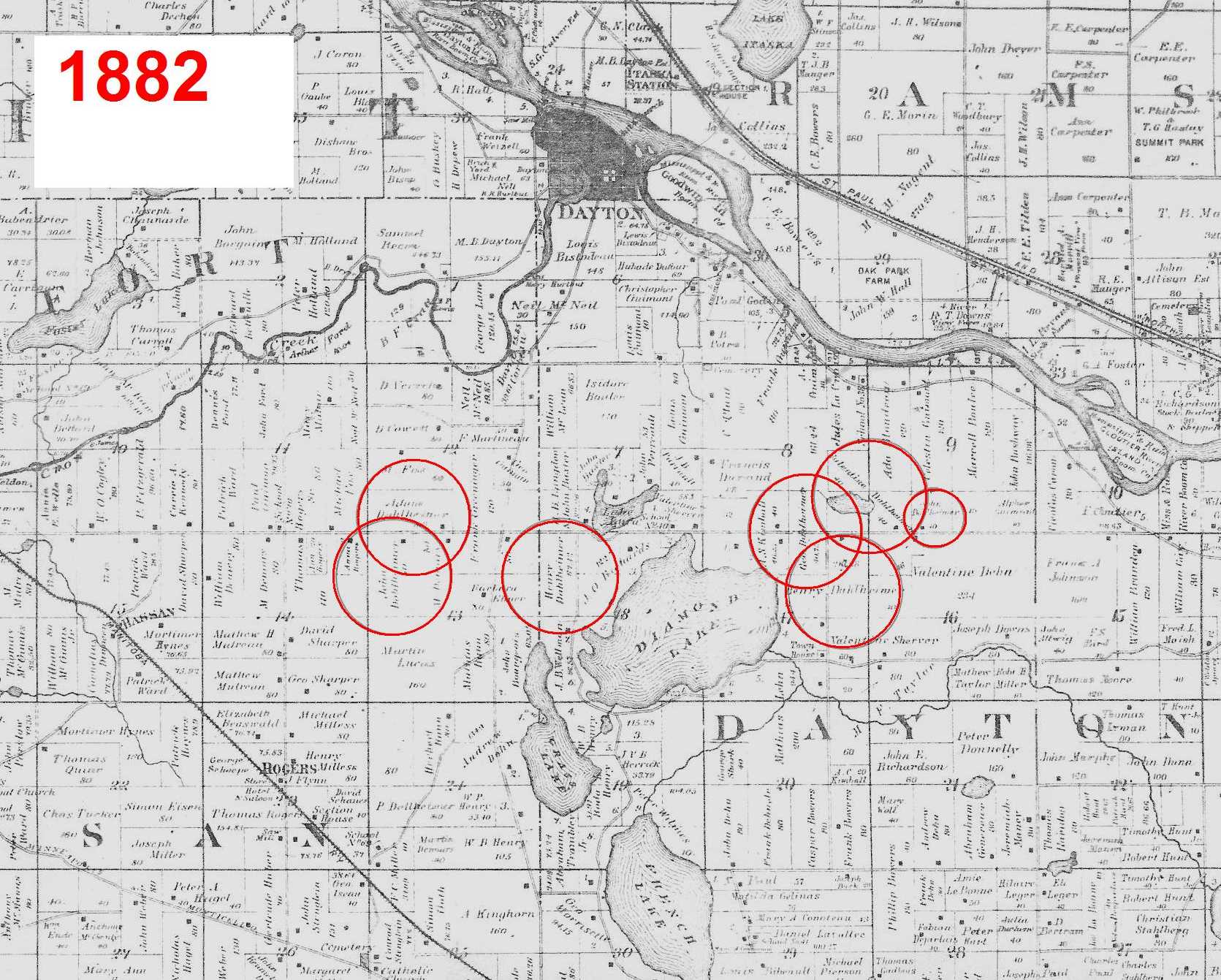 Following is an 1874 map showing these original land purchases by Valentine, Henry, and Philipp Dahlheimer: